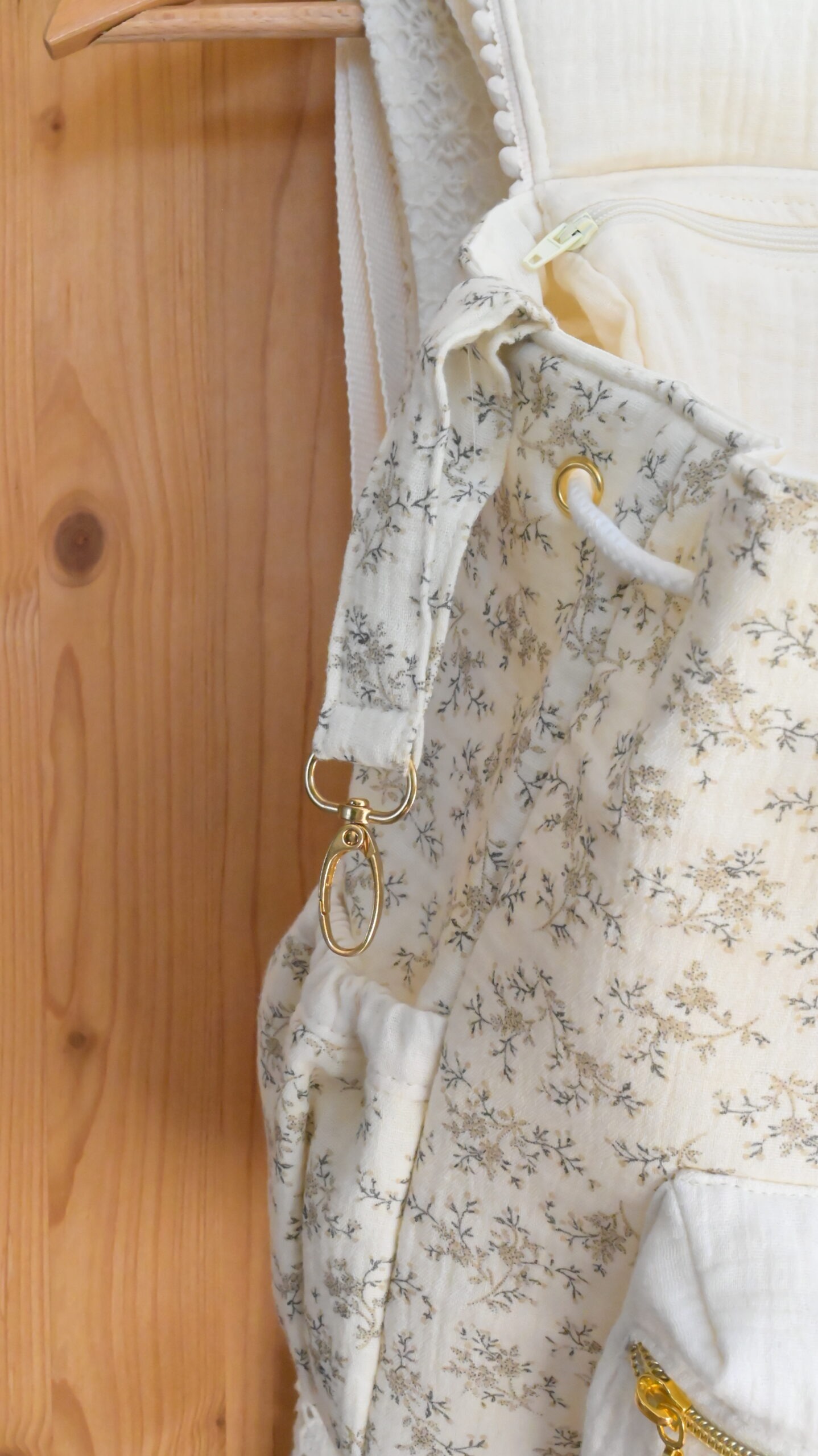 Organisรฉ et efficace ร l’intรฉrieur : 1 poche zippรฉe en gaze de coton รฉcru (accรจs rapide et sรฉcure) etย 2 plaquรฉes ( pour maintenir la gourde ou le bibi par ex.)